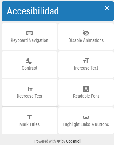 Los botones de accesibilidad están implementados en este portal para aumentar y disminuir el tamaño del texto y visualizar las páginas con alto contraste.