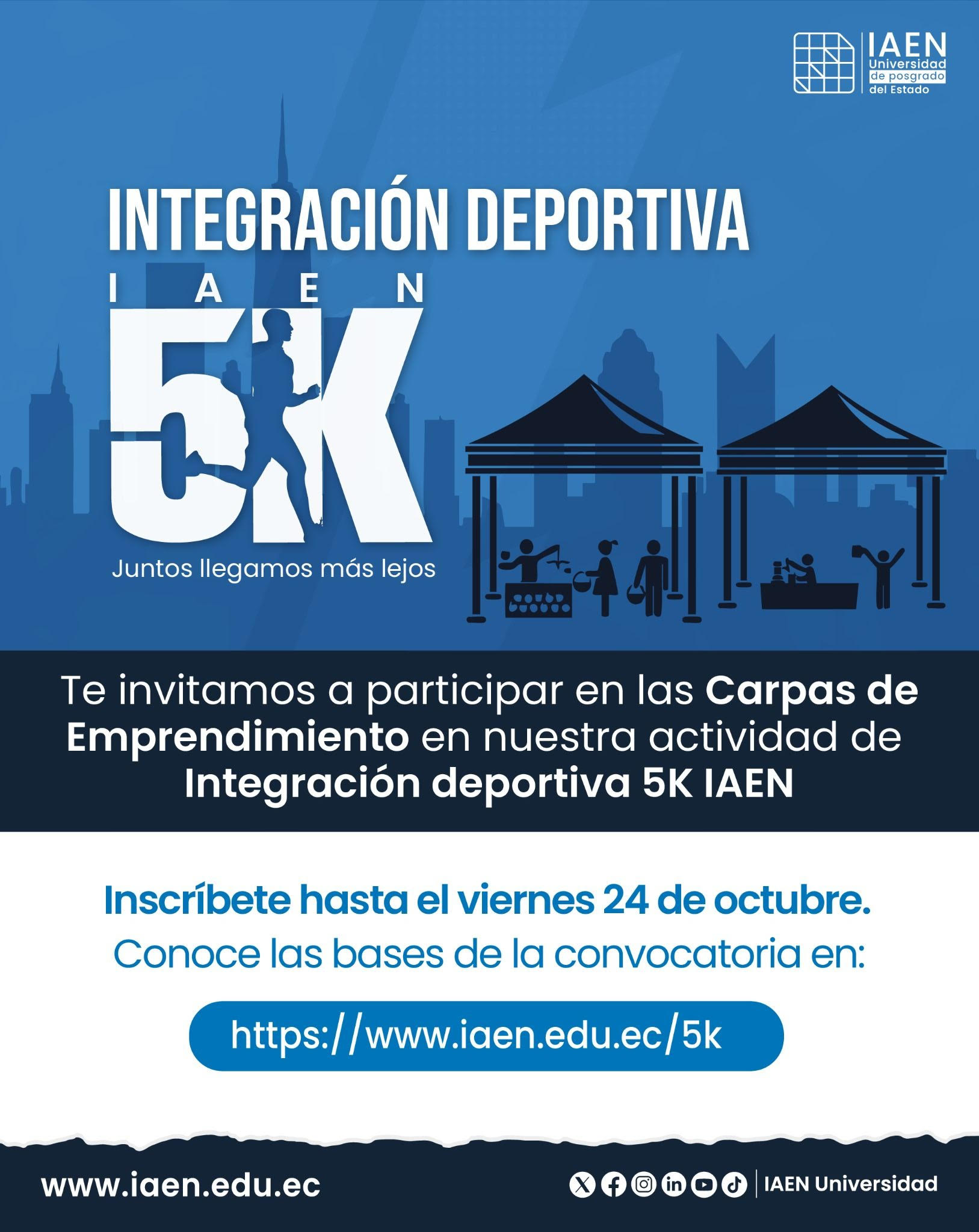 Fomentar el espíritu emprendedor 💡 y visibilizar los productos y servicios desarrollados por miembros de la comunidad universitaria del IAEN 🏫, en el marco de nuestra Actividad de Integración Deportiva 5K.