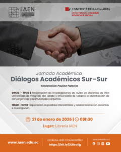 El Instituto de Altos Estudios Nacionales (IAEN) invita a la comunidad académica a participar en la Jornada Académica “Diálogos Académicos Sur–Sur”, un espacio de intercambio y reflexión orientado al fortalecimiento de la cooperación académica internacional.