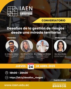 Únete a este espacio de reflexión académica organizado por la IAEN – Universidad de Posgrado del Estado, donde expertos abordarán los retos actuales en la gestión de riesgos desde lo local y territorial.