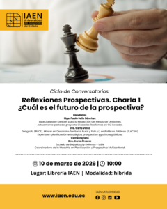 El IAEN – Universidad de Posgrado del Estado invita al primer encuentro del Ciclo de Conversatorios: «Reflexiones Prospectivas». En esta primera charla abordaremos una pregunta fundamental para la planificación estratégica: ¿Cuál es el futuro de la prospectiva?